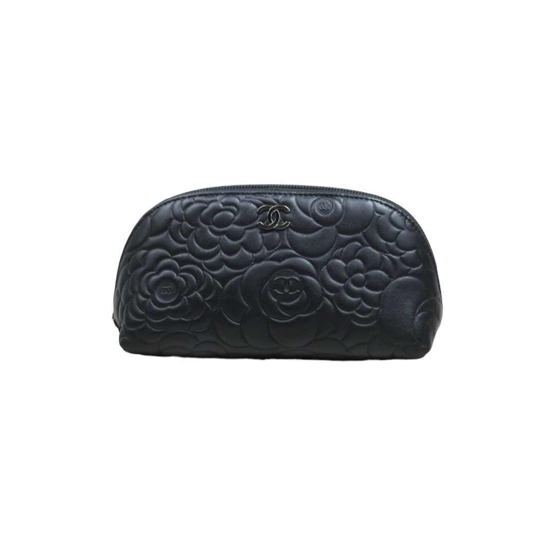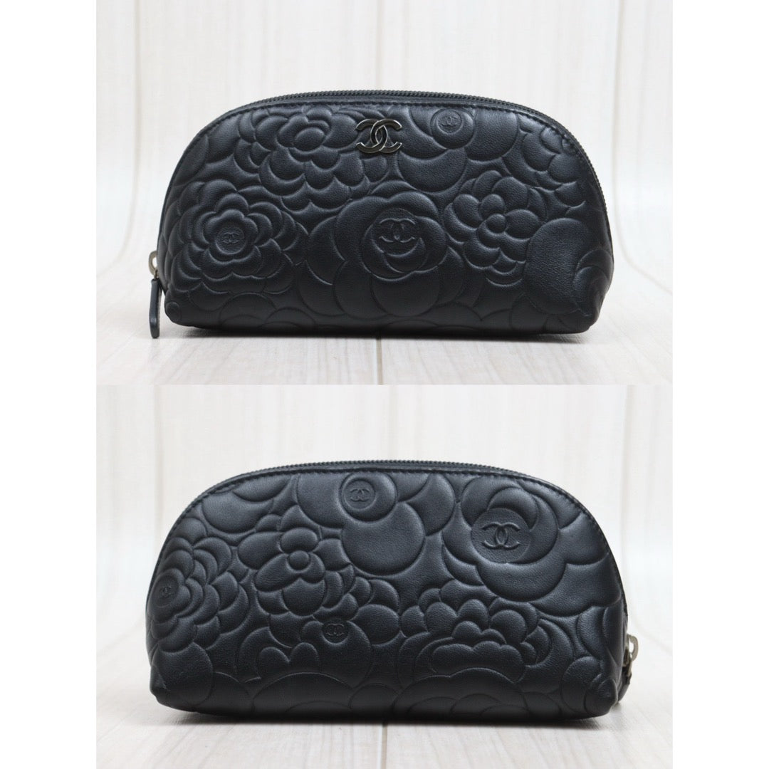 Very Good ( Rank A)| CHANEL Lambskin Camellia Cosme Pouch Black Made In 2012Year|26022403